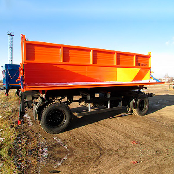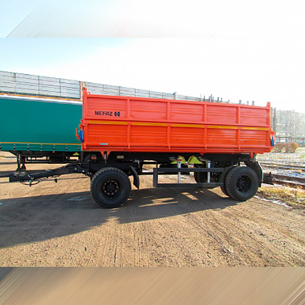 Двухосный самосвальный прицеп НЕФАЗ-8560-02 предназначен для перевозки различных сельскохозяйственных грузов, в том числе минеральных удобрений, а также сыпучих строительных грузов. Объем платформы составляет 15, разгрузка на 2 стороны. Подвеска рессорная, оси НЕФАЗ, двускатная ошиновка (9.00R20).