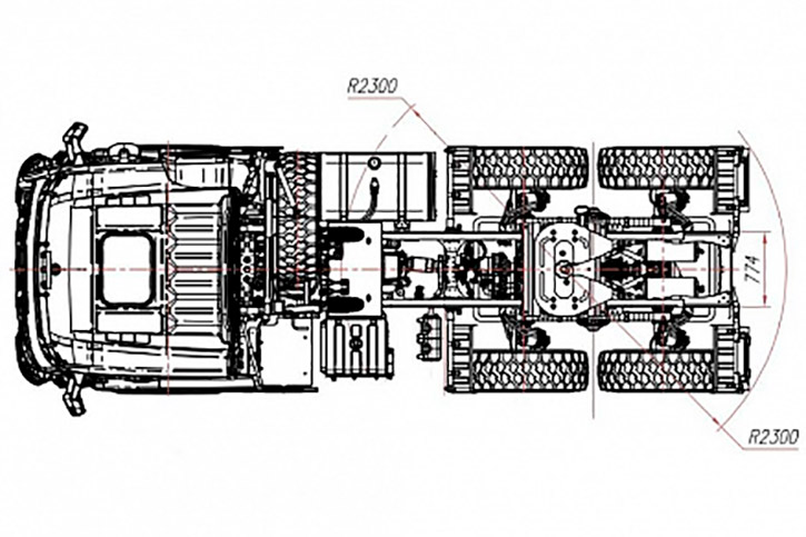 Грузовик отличается высокой степенью проходимости благодаря полному приводу: колёсная формула 6х6, все три моста – ведущие, с конической центральной передачей и планетарными колёсными редукторами. Также можно отметить высокий клиренс и прочный металлический передний бампер.
