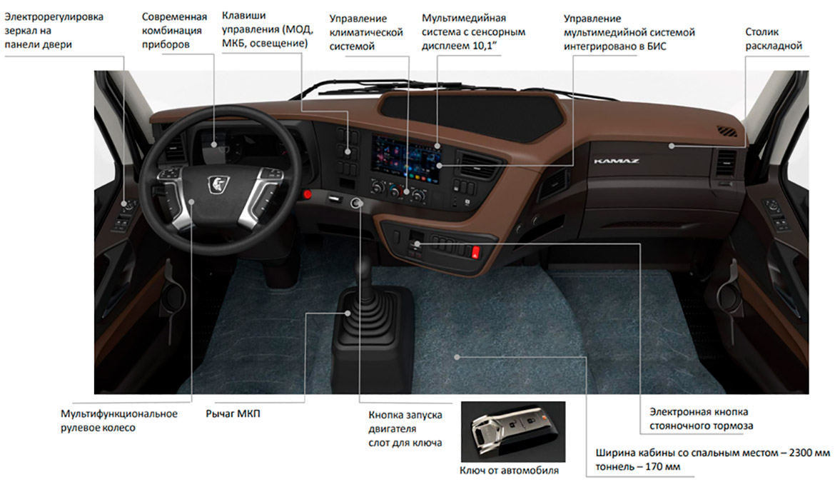 - Мультимедийная система с сенсорным дисплеем диагональю 10,1”, с голосовым управлением, функциями навигатора, радио, громкой связи, воспроизведения музыки, просмотра видео online или offline, контроля параметров автомобиля, управления отопителем кабины и предпусковым подогревателем;